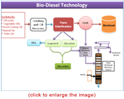 Bio-diesel production is the result of base catalyzed Trans-Esterification of oil/fats. Oil/fats contain triglycerides and glycerols which can be converted to FAME (Fatty Acid Methyl Ester) when reacted with alcohol and a base. Normally Methanol or Ethanol is used as the catalyst with a base to produce FAME. In this process Glycerols and FFA (Free Fatty Acids) are the byproducts, while alcohol can be recovered to recycle after concentration. We are also working on other innovative process to make it more efficient and cost effective